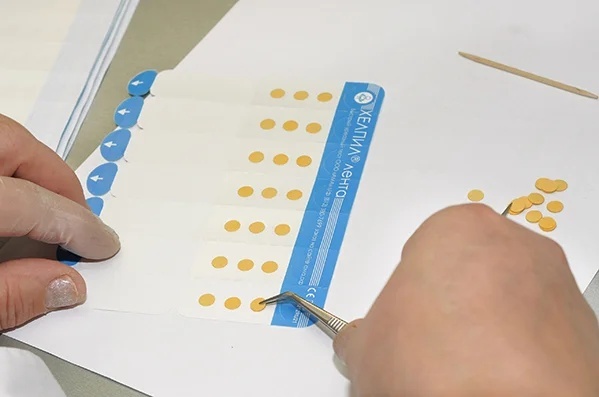 - Поместите биоптат, полученный в ходе эндоскопического обследования слизистой оболочки желудка и/или двенадцатиперстной кишки, на поверхность индикаторного диска.