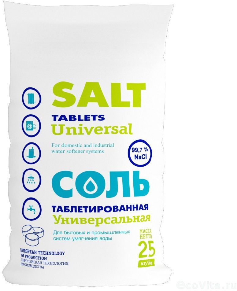 Таблетированная соль - Умягчение воды невозможно без одного очень важного расходного материала: таблетированной соли. Такая соль используется для восстановления "сердцевины" любой водоумягчительной установки - ионообменника, содержащего специальные синтетические смолы.