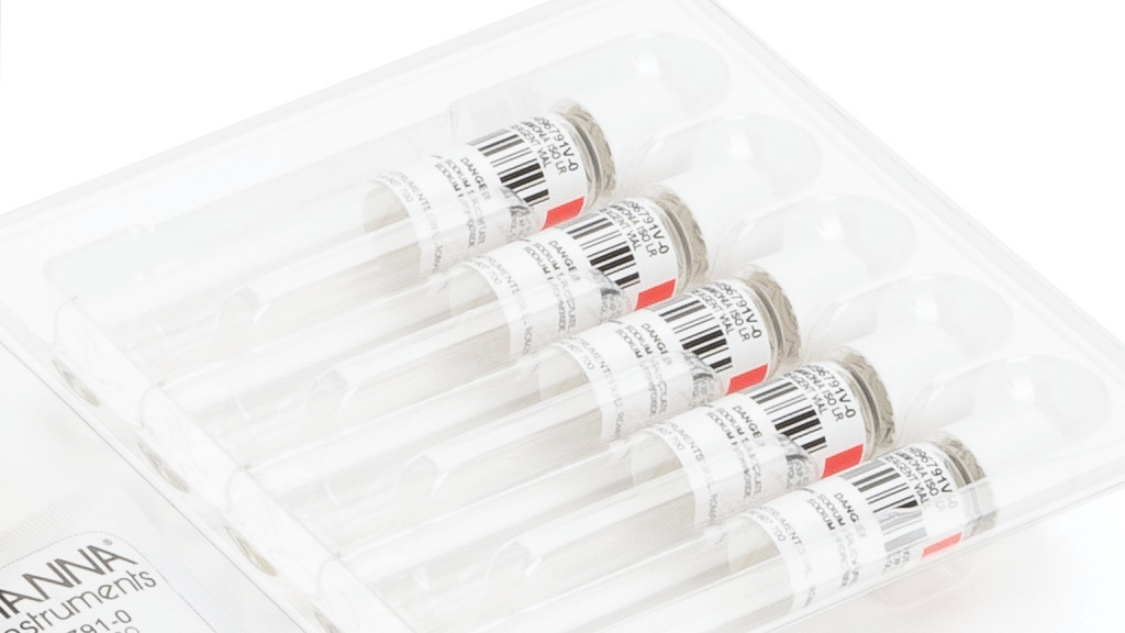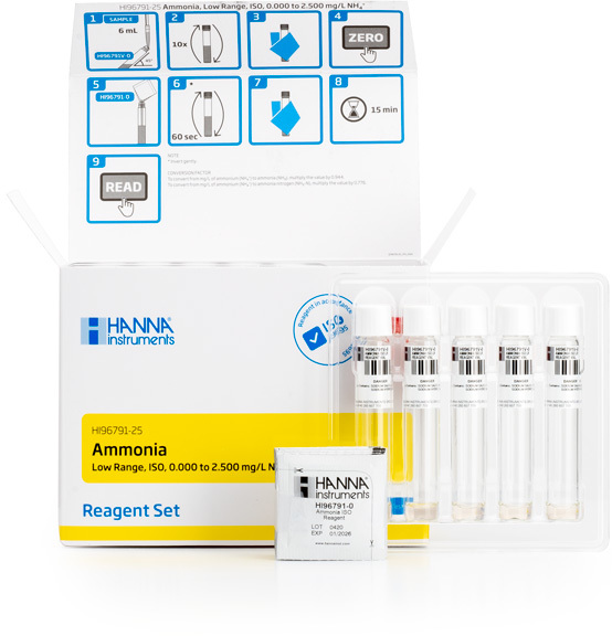Набор реагентов HI96791-25 содержит 25 готовых к использованию флаконов и 25 пакетиков с порошкообразными реагентами. Эти высококачественные реагенты используются для определения индофенолового синего по методу, соответствующему стандарту ISO 23695. При использовании этого метода реакция между аммиаком и реагентами приводит к изменению цвета образца с желто-зеленого на зеленый. Затем количество аммиака измеряется колориметрически. Интенсивность окраски определяется с помощью совместимого фотометра, а концентрация отображается в мг/л (ppm) аммония, диапазон: от 0,000 до 2,500 мг/л NH4+.