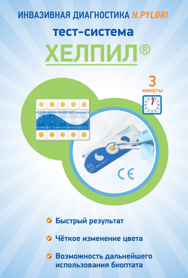 Тест-система ХЕЛПИЛ — это одноразовое устройство для инвазивной экспресс-диагностики инфекции Helicobacter pylori по уреазной активности биоптата, полученного в ходе эндоскопического обследования слизистой оболочки желудка и двенадцатиперстной кишки.