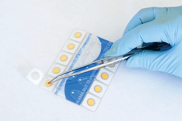 - Поместите биоптат, полученный в ходе эндоскопического обследования слизистой оболочки желудка и/или двенадцатиперстной кишки, на поверхность индикаторного диска.