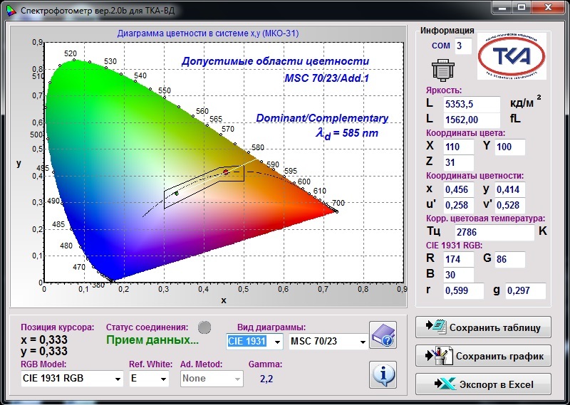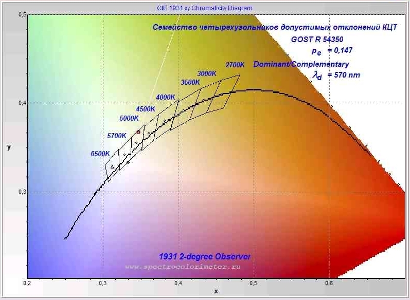 - Диапазоны измерения координат цветности
