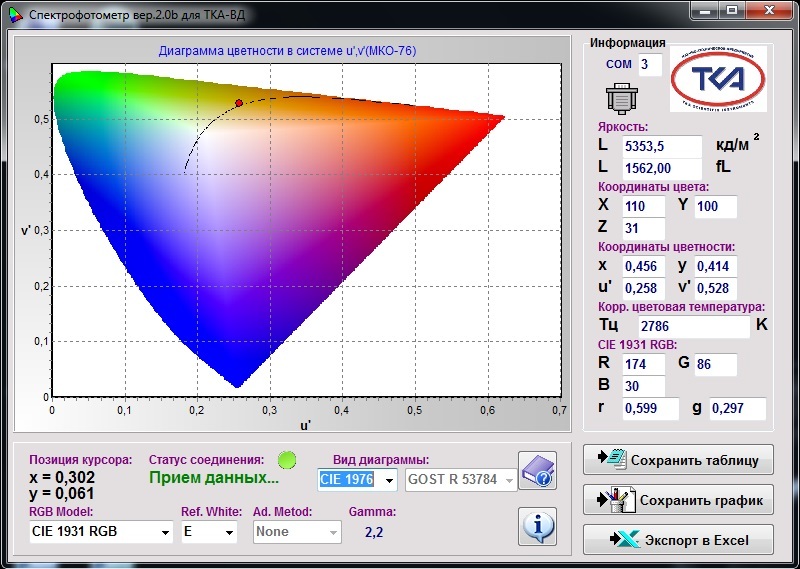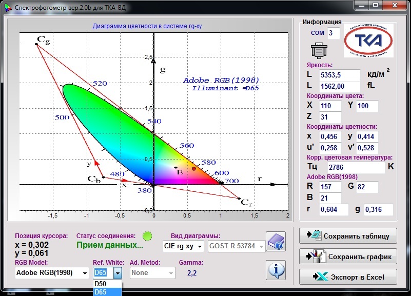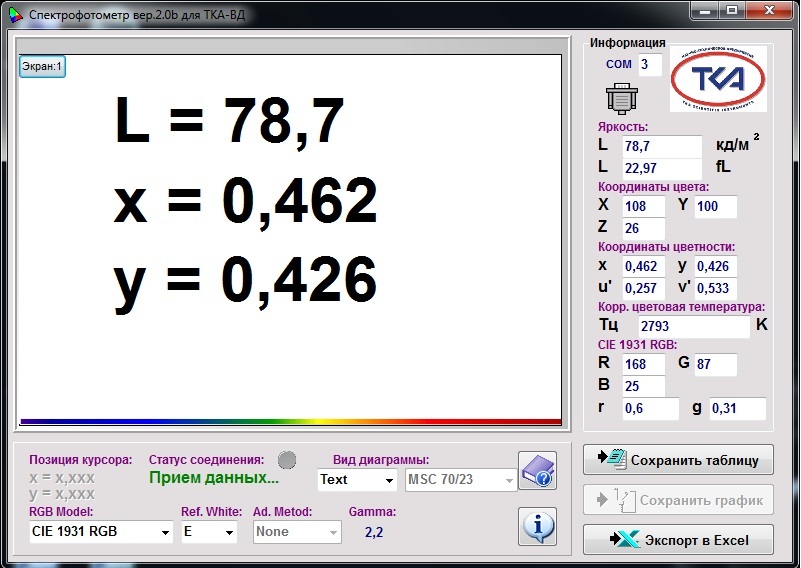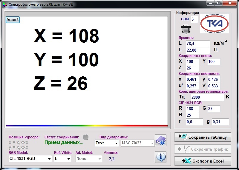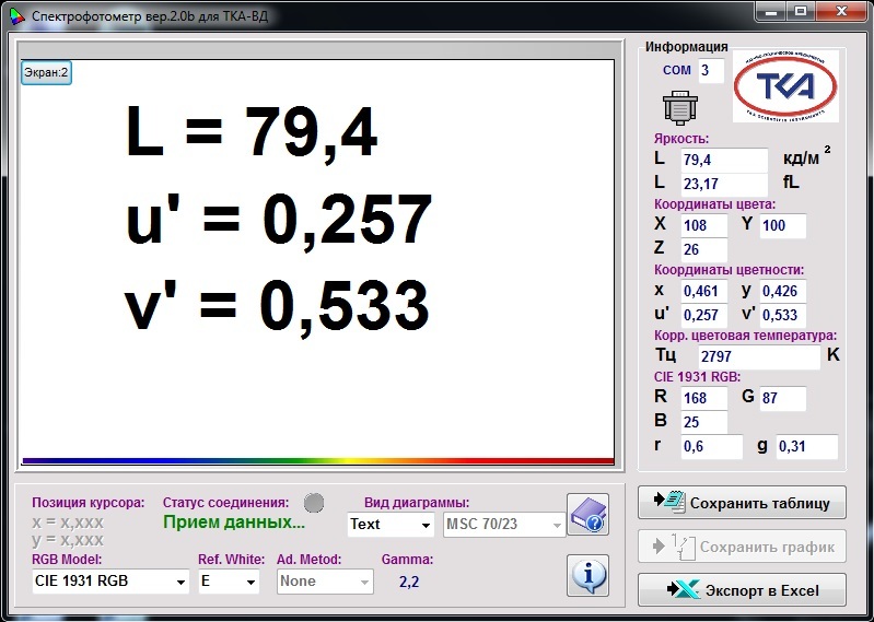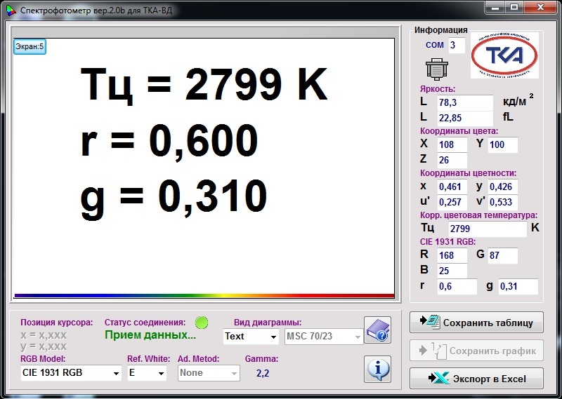 В приборе реализована уникальная возможность расчета значений коррелированной цветовой температуры в режиме реального времени и измерение точных значений координат цветности источника излучения по специальной программе, защищённой Свидетельством об официальной регистрации программы для ЭВМ №2003612396.