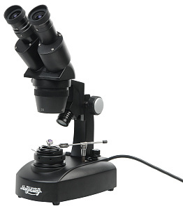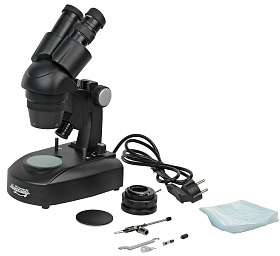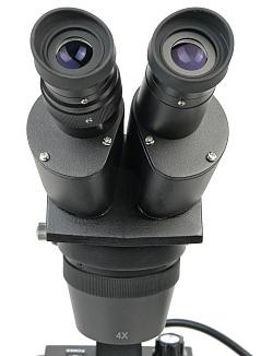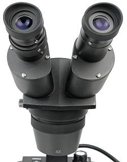 Объективы и окуляры. Микроскоп укомплектован блоком парных объективов с увеличением 2х и 4х. Использование этих объективов и комплектных окуляров дает общее увеличение 20х и 40х. При использовании дополнительных окуляров диапазон увеличения микроскопа может варьироваться от 10х до 80х. Рабочее расстояние объективов 70 мм вне зависимости от увеличения.