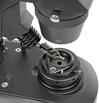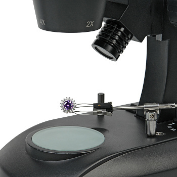 - Предметный столик микроскопа снабжен держателем с ювелирным пинцетом со сменными по высоте основаниями.