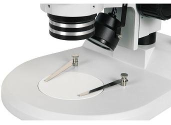 Для фокусировки микроскопа используется прецизионный зубчато - реечный механизм, перемещающий оптическую головку по демпфированным направляющим в диапазоне 50 мм. Основание микроскопа и корпус визуальной насадки изготовлены методом литья под давлением из алюминиевого сплава и имеют антистатическое покрытие. Штативная штанга из полированной стали с покрытием хромом.