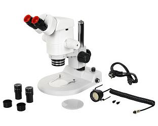 В комплект микроскопа входит объектив Plan 1х с постоянным рабочим расстоянием 80 мм. Микроскоп может быть доукомплектован объективами Plan 0.32х, Plan 0.5х, Plan 0,63х, ахроматами 1.6х и 2х. В комплект поставки микроскопа входит высококачественные окуляры с исправленной дисторсией WFH 10х – D с размером поля зрения 21 мм. Также доступны окуляры WF 5Х/24, WF 15/16, WF 20/12, WF 25/9 и WF10х/20 с сеткой или шкалой. Использование полного спектра оптики позволяет расширить диапазон увеличений от 1х до 250х.