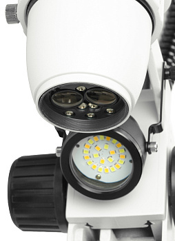 Осветитель отраженного света имеет мощность 3 Вт, он создает равномерное освещение поверхности диаметром до 200 мм. Для регулировки осветитель снабжен поворотными кронштейнами. Осветитель проходящего света встроен в основание и имеет мощность 5 Вт. Для размещения объекта исследования применяются круглые вставки, устанавливаемые в гнездо основания.