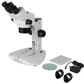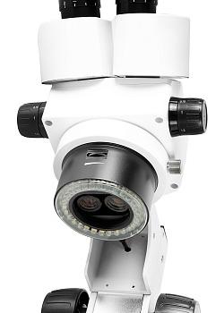 Отличительная особенность этого микроскопа - кольцевой светодиодный осветитель отраженного света с регулировкой яркости, который дает холодное бестеневое освещение. Так же у данной модели большой диапазон изменения увеличения панкратического объектива.