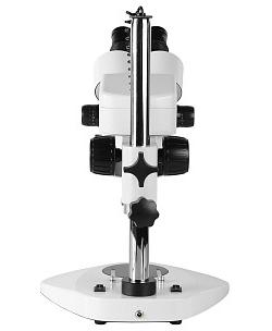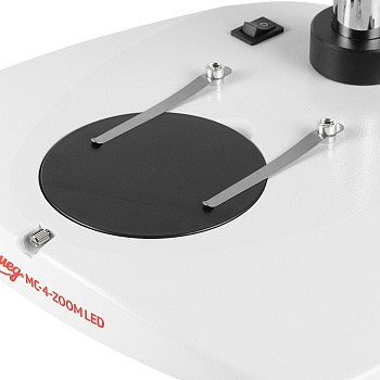 - Высокий штатив микроскопа позволяет работать с большими объектами, двукоординатным предметным столиком и насадкой 0,5х, увеличивающей рабочее расстояние.
