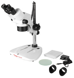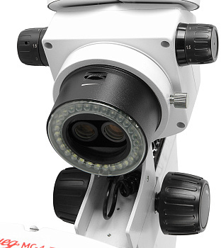 Отличительная особенность этого микроскопа - кольцевой светодиодный осветитель отраженного света с регулировкой яркости, который дает холодное бестеневое освещение. Так же у данной модели большой диапазон изменения увеличения панкратического объектива.