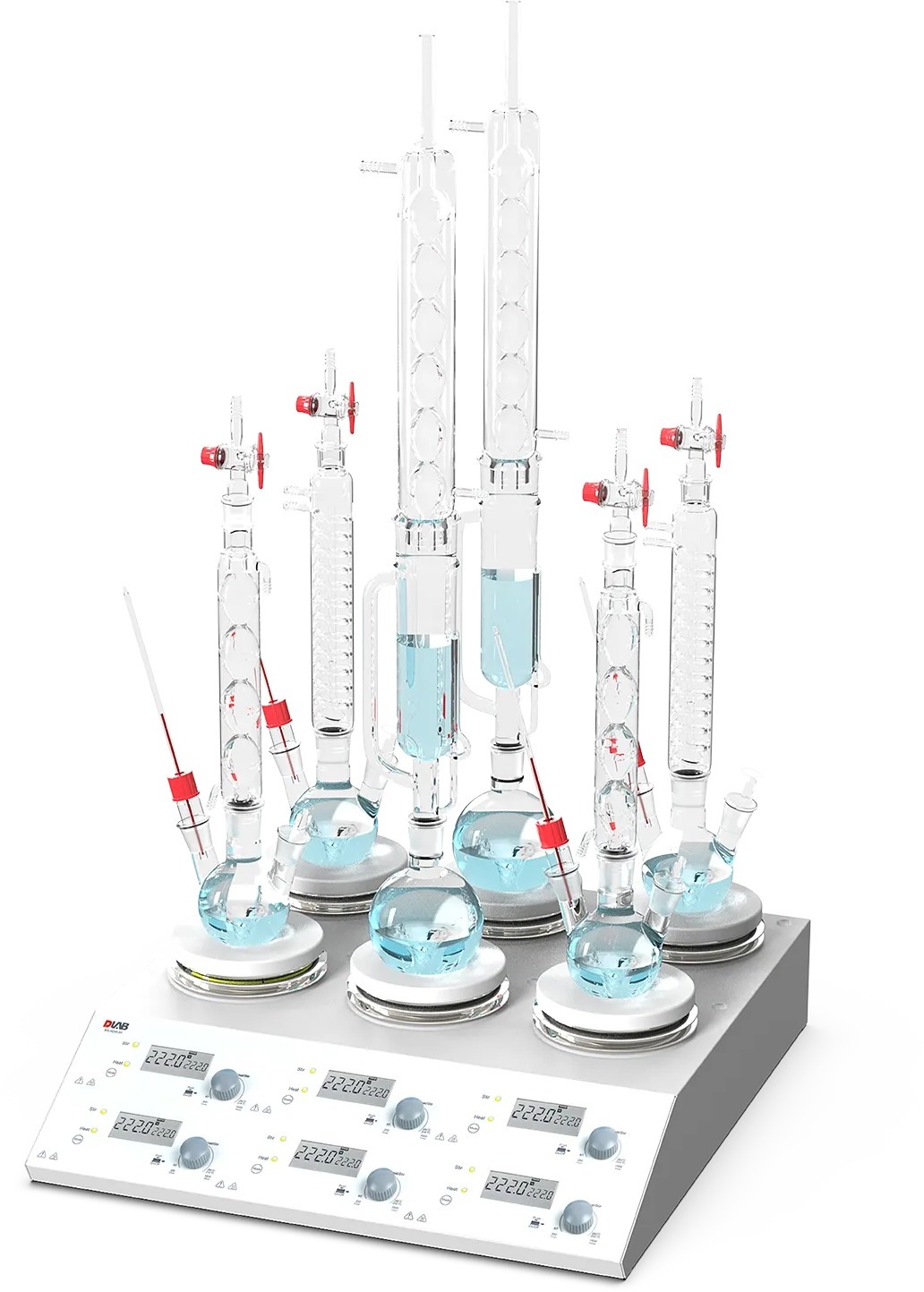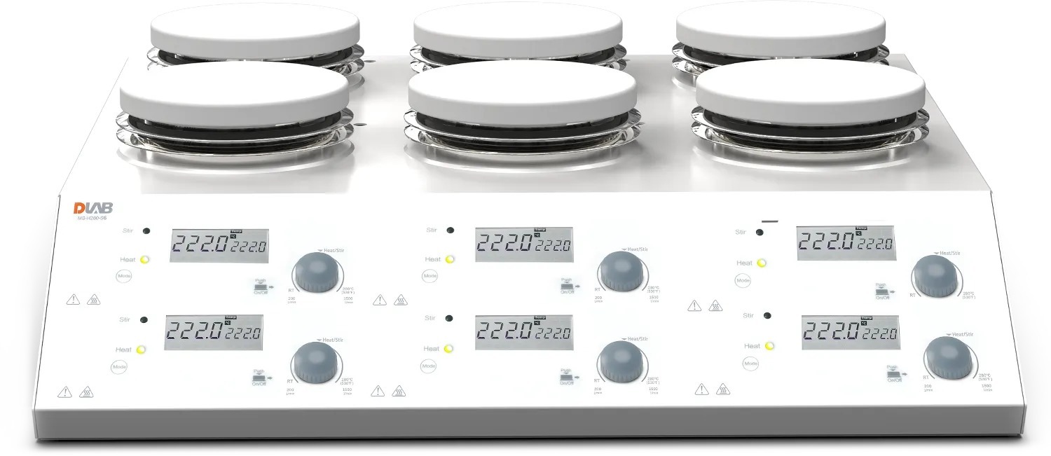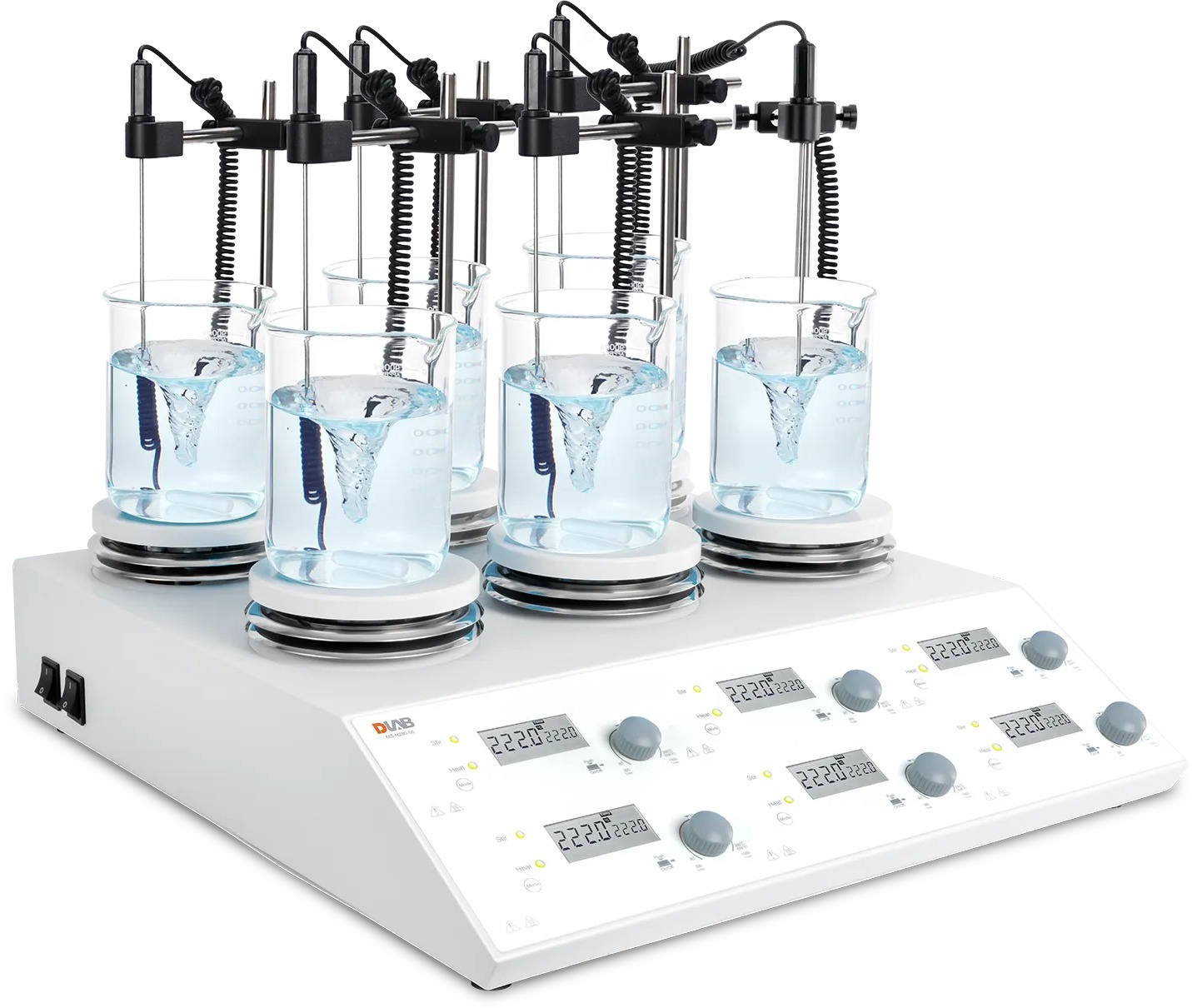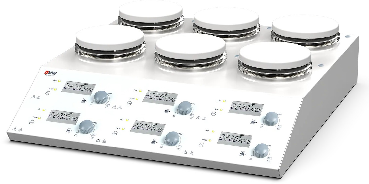 Магнитная мешалка состоит из шести независимо работающих платформ. Шесть цифровых ЖК-дисплеев обеспечивают точный контроль скорости и температуры нагрева каждого из образцов отдельно.