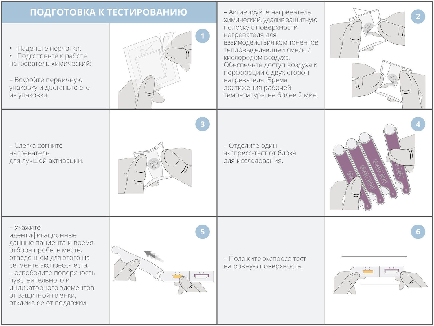 Во время тестирования возможно появление небольших красных/розовых пятен и вкраплений после соприкосновения образца биологического материала с индикаторным элементом теста. При интерпретации результатов тестирования необходимо учитывать только голубую и синюю окраску индикаторного элемента!