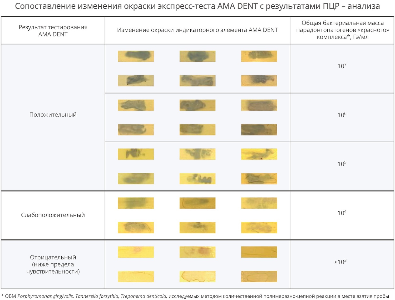 Появление голубого или синего пятна на индикаторном элементе экспресс-теста свидетельствует о наличии активности протеолитических ферментов патогенных бактерий «красного» комплекса (Porphyromonas gingivalis, Treponema denticola и Tannerella forsythia) в биологическом образце. Чем выше протеолитическая активность ферментов, тем интенсивнее окраска пятна. Результат тестирования оценивается как положительный.